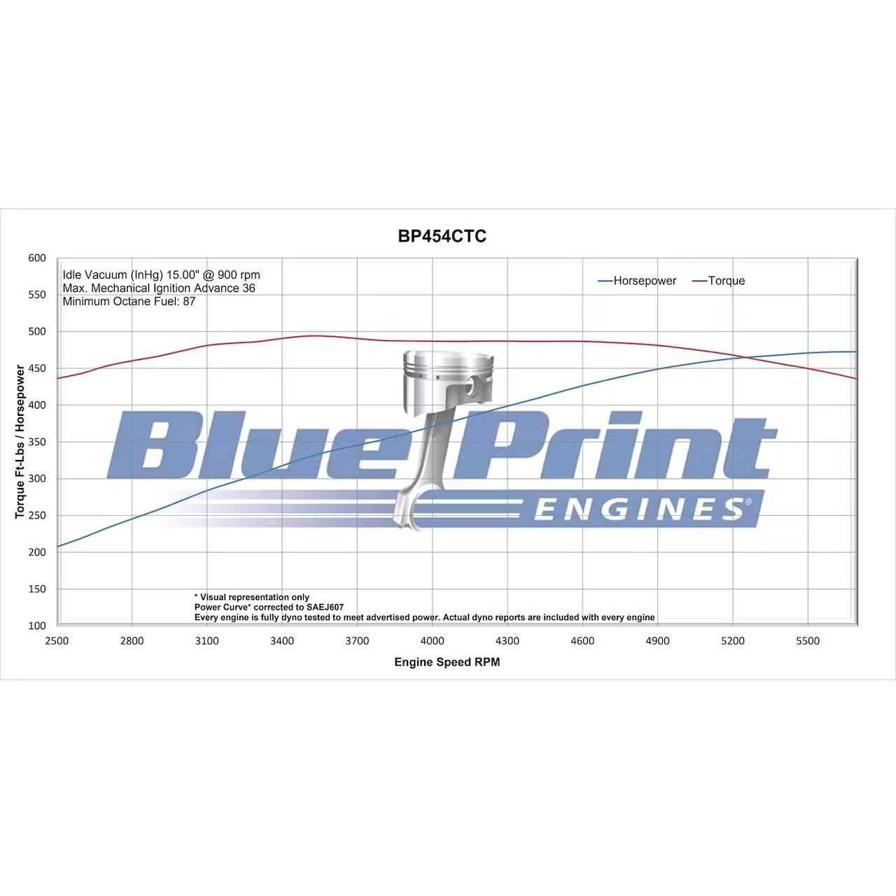 BluePrint BP454CTCK details BluePrint Engines Big Block Chevy 454 Cruiser Crate Engine Dressed Longblock With Carburetor and Polished Front Accessory Drive System HP And Torque: 460 HP / 479 FT LBS Compression Ratio: 9.85:1 Aluminum Heads Hydraulic Roller Cam Forged Crank Hyper-eutectic Pistons BLOCK: NEW BluePrint Cast Iron Block Manufactured and Machined in the USA! 4-Bolt Main 4.250″ Bore 1-Piece Rear Main Seal Mech fuel pump provision: Yes Standard Deck ROTATING ASSEMBLY: New BluePrint Forged Crankshaft 4.000″ Stroke 4.250″ Bore 6.135″ connecting rods w/ 150,000 psi bolts Hyper-eutectic pistons External CYLINDER HEADS: BluePrint Aluminum Cylinder Heads – PS8013 119cc chamber 2.30″ intake/1.88″ exhaust valves 316cc intake/124cc exhaust runners Cylinder heads feature a .300 in. raised exhaust port vs an OEM