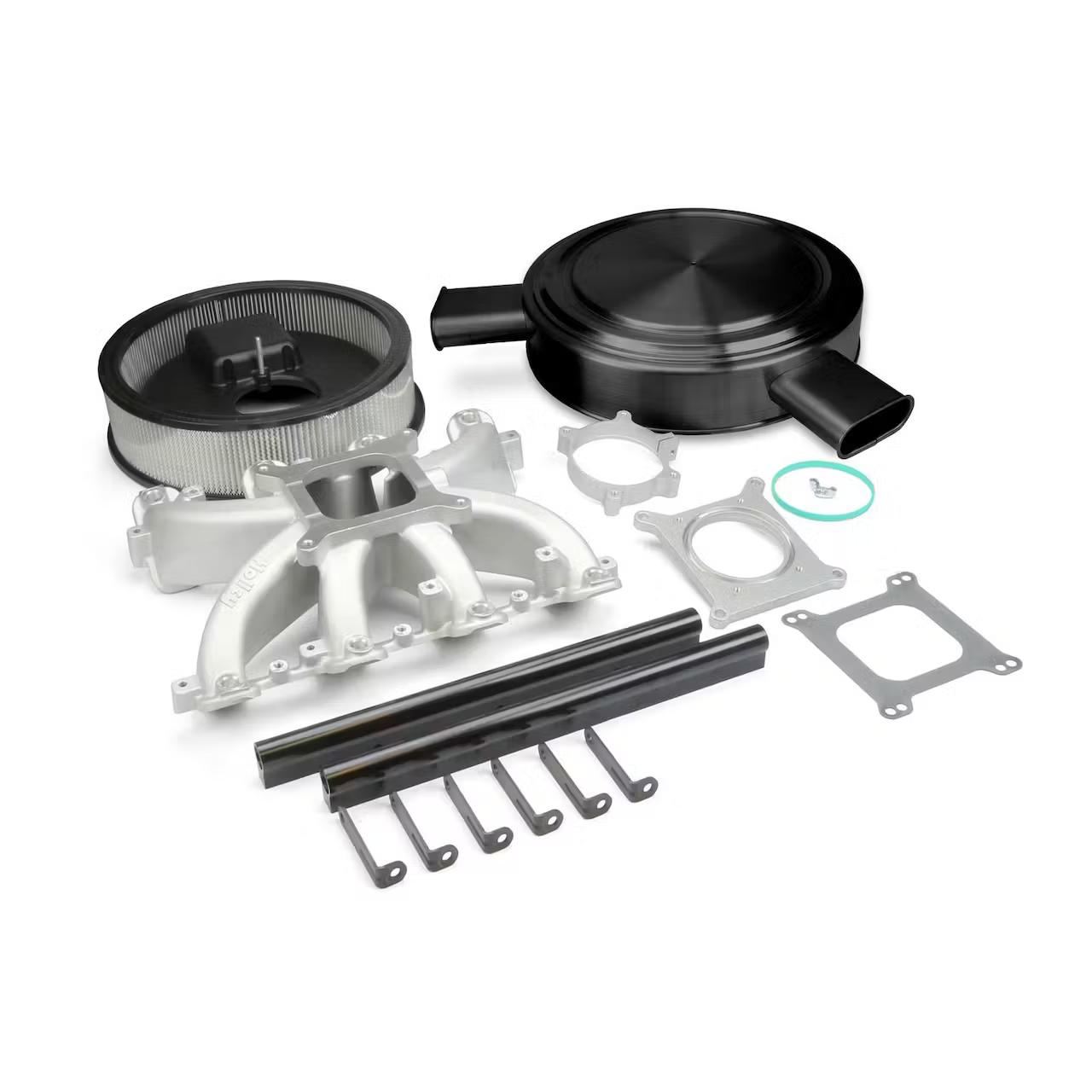 The LS Classic Series Chevy 409 Intake Kit is designed to pay respect to the classic muscle cars and trucks of the 50’s and 60’s while using modern technology for ultimate performance. The intake kit includes a single plane aluminum intake manifold, billet aluminum fuel rails, black, dual snorkel, round air cleaner, 4150 carb adapter plate, all mounting hardware, and gaskets The systems utilize GM LS3 OEM fuel injectors and GM four bolt, 92mm, drive-by-wire throttle body (not included) Compatible with GM and aftermarket ECU’s and harnesses that support both drive-by-wire and speed density tuning Manifolds are designed to work with Cathedral port LS cylinder heads